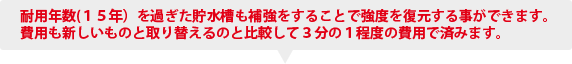 貯水槽は設置後すぐに劣化が始まります。 およそ20年後には強度が50%近くまで落ちると言われています。 古くなった貯水槽は地震に弱いだけでなく、内部の水圧によっても水漏れや 破裂といった事故が起こります。